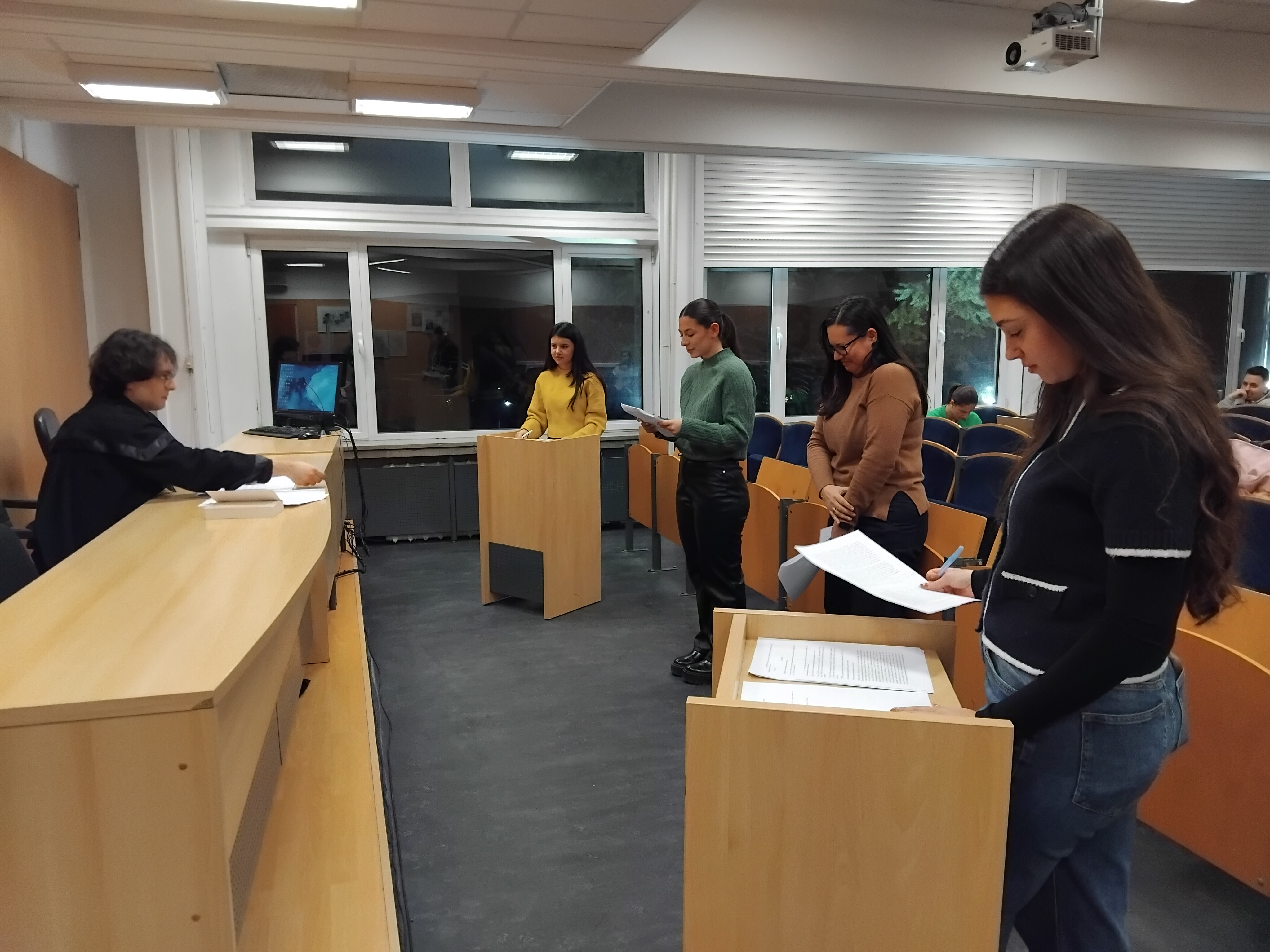 На 11 юни 2024 г., в учебната съдебна зала – 210, корпус 1 се проведоха симулативни съдебни процеси, организирани от студентите от четвърти курс на специалност „Право“ Магдалена Екмекчиян и Натали Али, под ръководството на преподавателите в Департамент „Право“ доц. д.ю.н. Ивайло Стайков и гл. ас. д-р Мария Чочова. В симулираните съдебни процеси взеха участие студентите: Магдалена Екмекчиян, Натали Али, Грета Герасимова, Яра Хабаш, Мира Бакърджиева, Никола Вълканов, Мурад Табаков, Лора Ячкова, Даниел Алексиев.